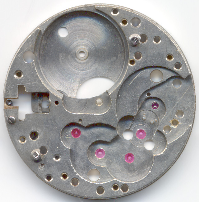 Auf der Zifferblattseite erkennt man schon den Kupplungsaufzug mit seiner sehr charakteristisch geformten Winkelhebelfeder. Und auch hier sieht man wieder anhand des einfachen Decksteins, daß die Unruh nicht stoßgesichert ist.
