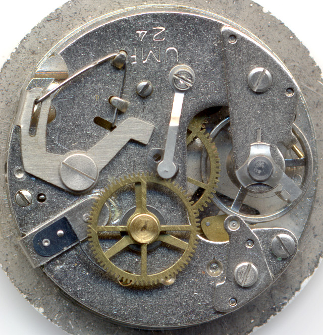 Beim UMF 24-35 kann nun mit Hilfe eines Hebels (in Versionen A und B aus Metall, später aus Plastik) den Zahnkranz anhalten, und damit auch die Zentralsekunde stoppen.