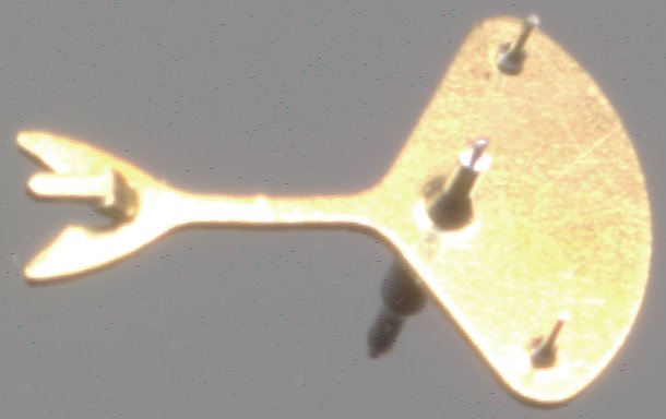 Der gestanzte Anker mit seinen beiden Ankerstiften reguliert in diesem Werk den Ablauf. Kein Präzisionsinstrument, aber dafür eine preiswerte Konstruktion, die seinerzeit auch weniger betuchten Bürgern den Besitz einer Armbanduhr ermöglichte. Seine große Ankerfläche ist ideal dafür, die lange Ankergabel, respektive ihre Hebelkräfte, zu kompensieren, was der Lageunabhängigkeit entgegenkommt.