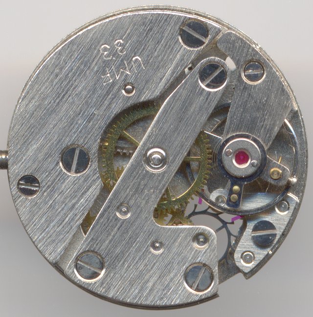 Das UMF Kaliber 33-50 ist eine der älteren Ausführungen des 8 3/4 linigen “Diva” bekannt. Es ist ohne Stoßsicherung und auch nur mit sieben Steinen ausgestattet, dafür besitzt es aber eine Palettenankerhemmung. An Anzeigen gibt es auch nur Stunde und Minute.