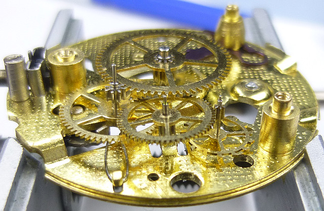 Video on YouTubeDie Messing-Grundplatine ist gestanzt und mit einem Punktmuster “dekoriert”. Die obere Werkplatine ist auf drei Pfeilern gelagert.