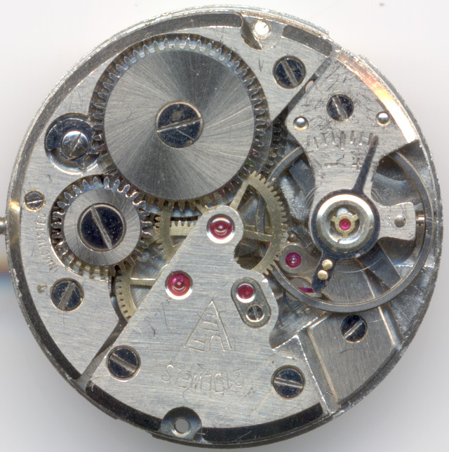 Die Grundplatine verrät den konservativen, damals gerne verwendeten Werksaufbau mit zentralem Minutenrad. Dieses ist beim Uwersi 57/10 sogar steingelagert!