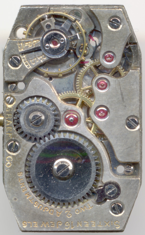 Dieses Werk ist mit “GRAEF CO.” und “SIXTEEN 16 JEWELS” signiert, außerdem besitzt es “TWO 2 ADJUSTMENTS”. Zifferblattseitig sind noch die Zahlen “35” und “527317” eingeschlagen.