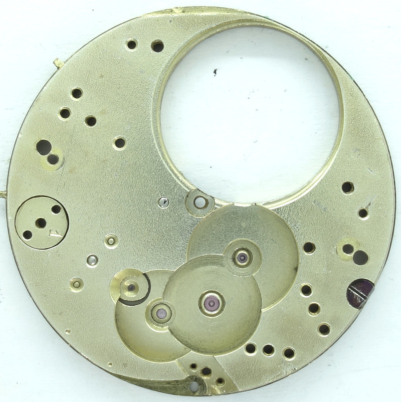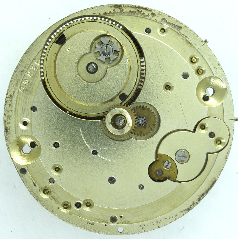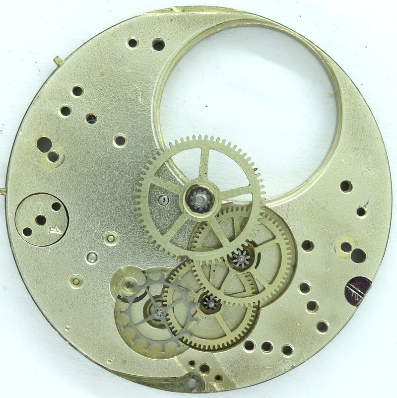 Das Räderwerk folgt dem üblichen Aufbau mit Federhaus, zentralem Minutenrad, Kleinbodenrad, Sekundenrad und Zylinderrad.