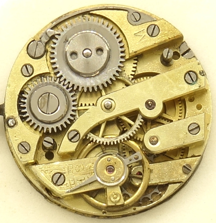 Der Räderwerksaufbau ist typisch für ein Zylinderwerk, das auf eine dezentrale Sekundenanzeige verzichtet, denn das Sekundenrad liegt weder senkrecht, noch im 90°-Winkel zur Aufzugswelle.
