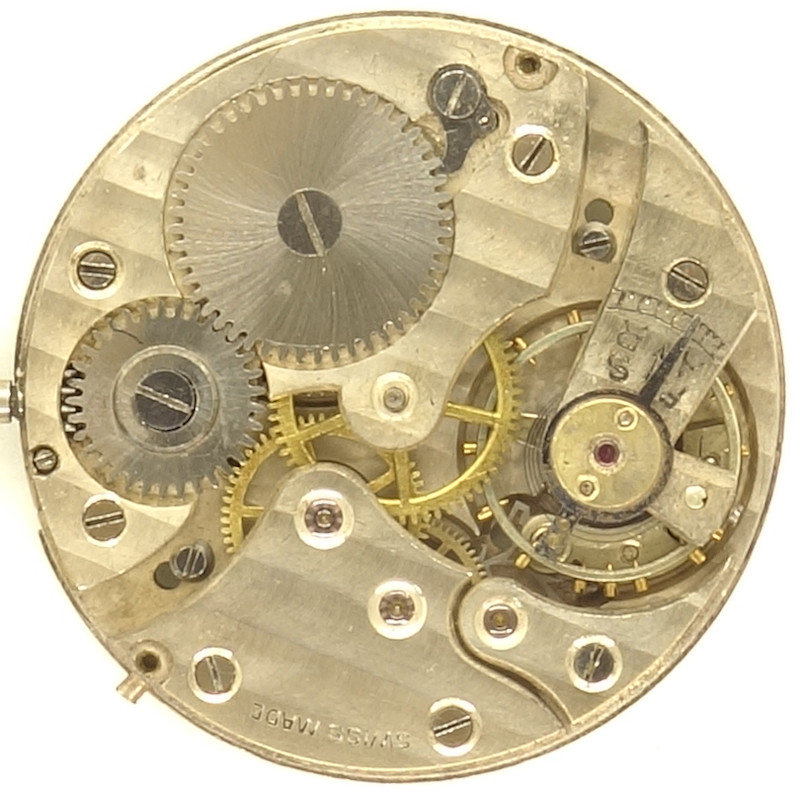 Die natürlich noch nicht stoßgesicherte monometallische Schraubenunruh schlägt mit 18000 Halbschwingungen pro Stunde und reguliert ein schweizer Palettenankerwerk.