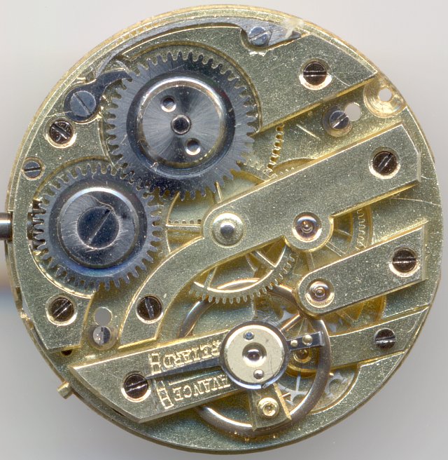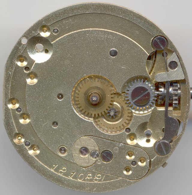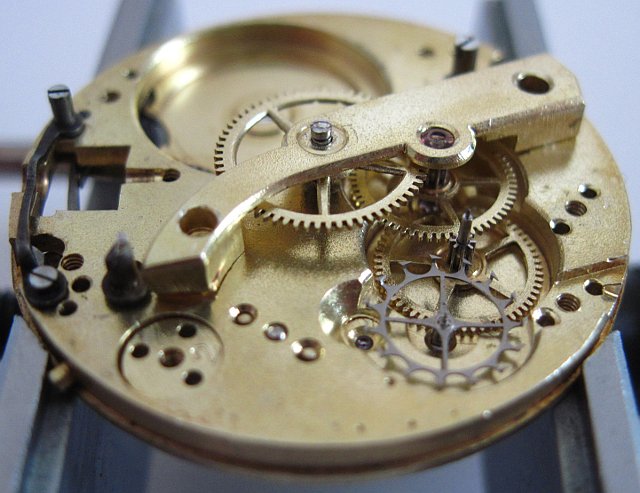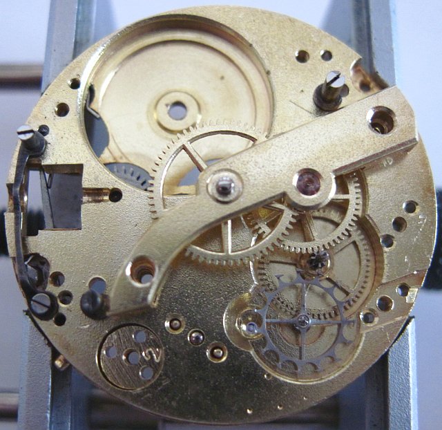 Bei diesem Werk läßt sich die Minutenradbrücke nicht entfernen, da das Minutenrad eine Rutschkupplung auf der Werksseite (außerhalb des Lagersteins besitzt), welche sich bei dem hier vorliegenden Exemplar nicht ohne Beschädigung entfernen läßt.