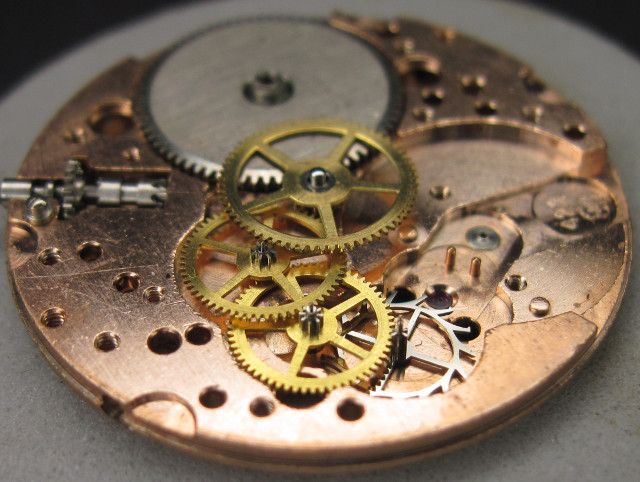Der Räderwerksaufbau ist absolut klassisch, mit direkt angetriebenem Minutenrad und dezentraler Sekunde (sofern genutzt) auf 6 Uhr.