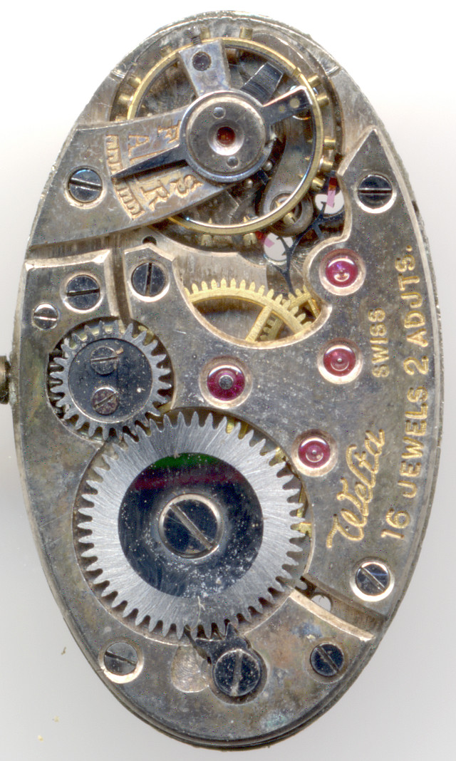 Dieses Werk mit seiner charakteristischen Ellipsenform (6 1/2 x 11 Linien) ist mit “Welta SWISS” markiert, es besitzt “16 JEWELS 2 ADJTS”. Zifferblattseitig ist noch die Zahlenfolge “560” eingeschlagen. Auffällig ist bei diesem Werk, daß die Unruh zwar farblich vorgibt, aus Bimetall zu bestehen, aber der charakteristische Schlitz, der die Bimetall-Dehnung ermöglicht, fehlt.