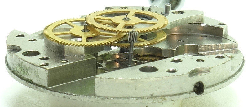 Als Unruh kommt eine goldfarbige, zweischenklige, vermutlich Glucydur-Ringunruh zum Einsatz, die noch gemächlich mit 18000 Halbschwingungen pro Stunde arbeitet.