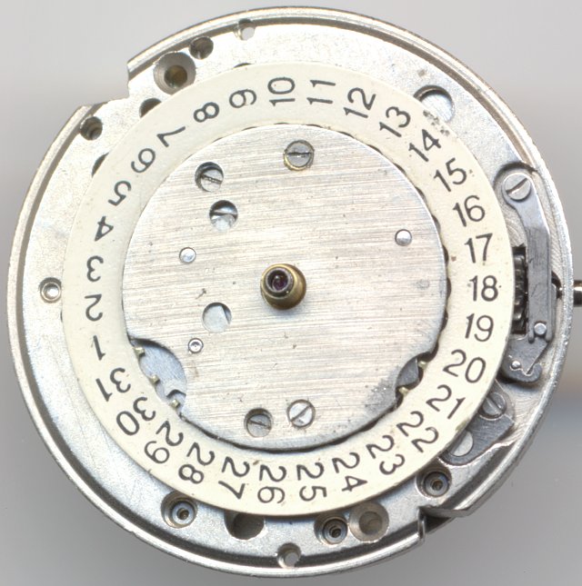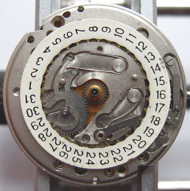 Das Datum springt schlagartig um Mitternacht eine Stelle weiter, wenn der Datumshebel, der vom Datumsrad ganz nach oben gespannt wurde, sich schlagartig entlädt.