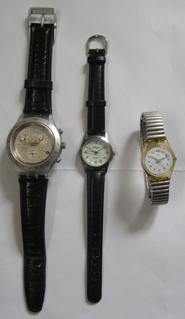 Von Frau Kannter gab es diese überraschende Spende dreier Quarzuhren. Neben einer Noname-Damenuhr mit noch sehr gut erhaltenem Armband, war im Päckchen auch eine 1996er Swatch-Damenuhr und einen riesigen Swatch Irony Diaphane Quarz-Chronographer, der den bekannten Fehler, die ausgefallene 1/10-Sekunden-Anzeige aufweist. Vor allem der Diaphane-Container-Mechanismus war eine echte Herausforderung, die aber gut gemeistert werden konnte; das Werk selbst, also der defekte Zehntelsekunden-Indikator ist leider irreparabel aber trotzdem sehr interessant.