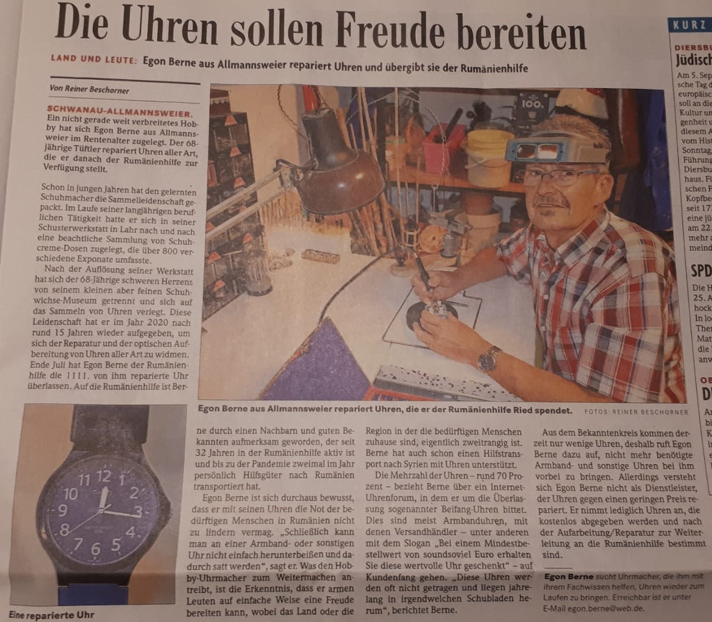 Dieses Projekt, das im Uhr-Forum seinen Ursprung hat, besteht darin, noch brauchbare Uhren zu sammen, aufzubereiten und als Spende nach Rumänien zu schicken, wo sie mehr als dankbar aufgenommen werden. Bis Januar 2024 konnten auf diese Weise fast 2500 Uhren neue Besitzerinnen und Besitzer finden, und es geht immer weiter.
