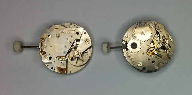 Das EMES 12 (links) wurde von EB (Ebauches Bettlach) konstruiert und das EMES 18a ist ein französisches Parennin-Werk. Beide Werke wurden als Teile bezogen und bei EMES montiert.