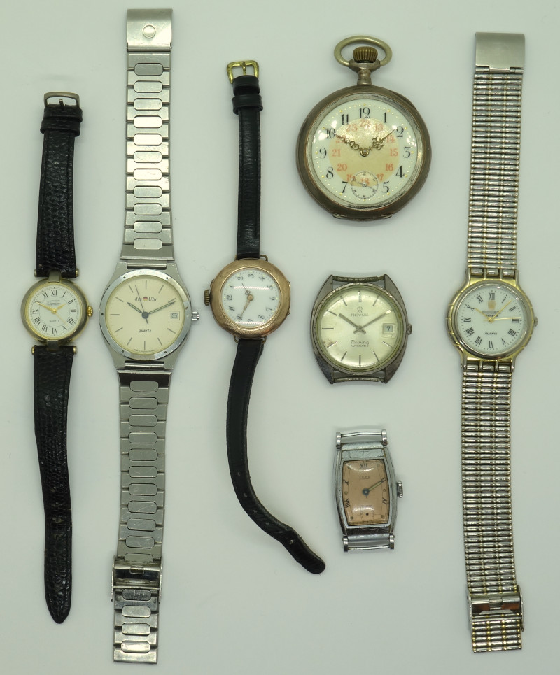 Weiterhin sind noch zwei vermeintliche Markenuhren dabei, die natürlich nichts mit dem Original zu tun haben, und Quarzwerke besitzen, eine anonyme Quarzuhr mit dem sehr späten Junghans-Quarz-Kaliber 669.31, und eine Revue-Herrenuhr, in der ein ETA 2472 verbaut ist, gelabelt als MSR T.26.