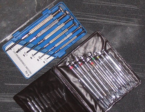 Was aber ist von billigen Schraubendrehersets zu halten? Ich selber habe die Erfahrung gemacht, daß sie durchaus auch ihren Zweck erfüllen, allerdings nur, wenn man einen Trick anwendet: Vor jeder größeren Aktion und spätestens dann, wenn man merkt, daß eine Klinge stumpf geworden ist, müssen die Klingen auf einem Streifen Sandpapier wieder in die richtige Form gebracht und geschärft werden. Damit kommt man auch mit einem Billig-Satz wunderbar über die Runden, ohne Uhrwerke und Schraubenköpfe zu ruinieren, und trotzdem noch genug Geld für weitere Werkzeuge übrig zu haben.