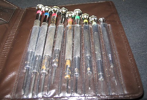 Normalerweise sollte beim Uhrenbasteln das Beste gerade gut genug sein. Das Problem dabei ist nur, daß das ziemlich ins Geld geht, da ein Satz wirklich guter Schraubendreher (beispielsweise von Bergeon) leicht in den dreistelligen Euro-Bereich geht. Für Flohmarktuhren rechnet sich das nur schwer.