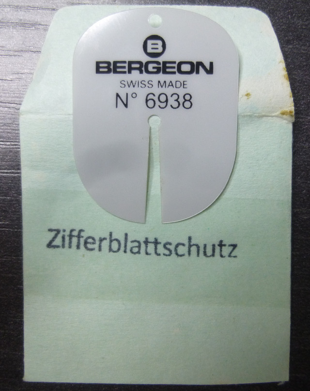 Eines der wichtigsten (und auch gleichzeitig auch preiswertesten) Werkzeuge einer Uhrenwerkstatt ist der Zifferblattschutz, im Wesentlich eine dünne Weichplastikscheibe mit Ausfassung für das Zeigerwerk. Einer der professionellen Vertreter ist der Bergeon 6938.