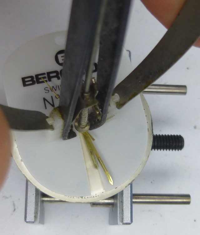 Beim Abheben der Zeiger sorgt der Zifferblattschutz dafür, daß das Werkzeug (beispielsweise ein Presto-Zeigerheber) nicht mit dem Zifferblatt in Kontakt bekommt und dort häßliche Spuren hinterläßt.