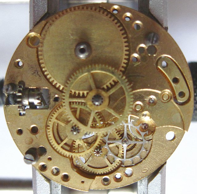 Video on YouTubeMit 10 Lagersteinen ist bei einem Zylinderwerk die steinmäßige Vollausstattung erreicht - so auch bei diesem Werk. Auch wenn man theoretisch noch zwei weitere Steine für die Minutenrad-Lagerung verbauen könnte, so ist mir bis dato kein solches Zylinderwerk untergekommen.