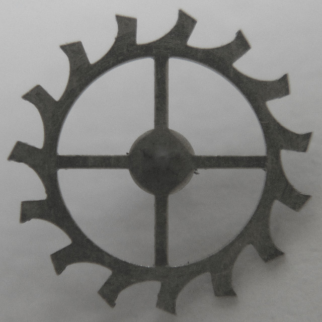 Das Ankerrad ist eines der schönsten, das mir bisher in einem Stiftankerwerk begegnet ist. Seine Form und Ausführung ist bis auf die etwas breiteren Zähne identisch mit der, eines Ankerrads eines Palettenankerwerks.