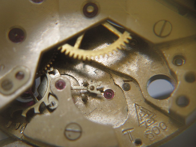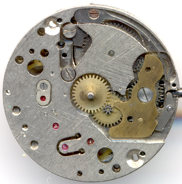 Zifferblattseitig erkennt man gut den Wippenaufzug und das Gesperr mit Sperrklinke und -Feder.