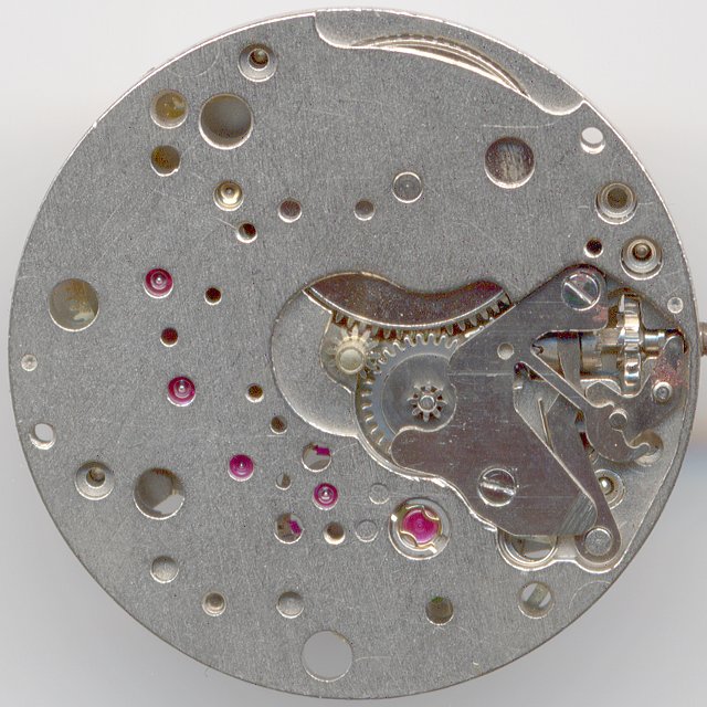 Der Aufbau orientiert sich an Roskopf-Werken: Von der Werksseite gibt es keine direkte Verbindung zum Zeigerwerk, dieses wird zifferblattseitig vom Federhaus(!) angetrieben.