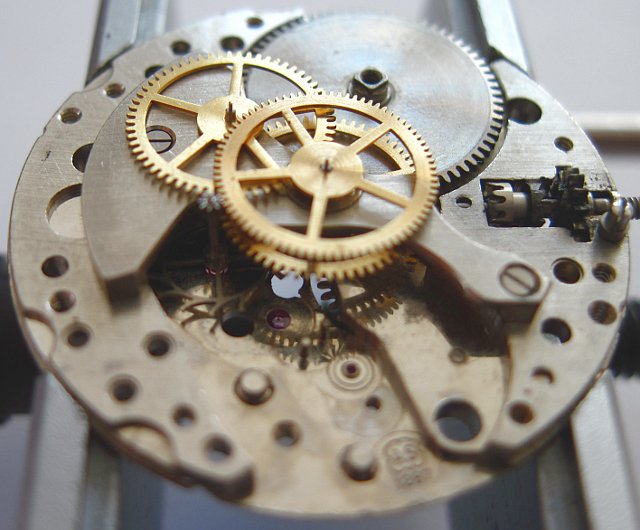 Das Räderwerk ist mit zentral unter einen eigenen Brücke gelagertem Minutenrad auf dem seinerzeitigen Stand der Technik.