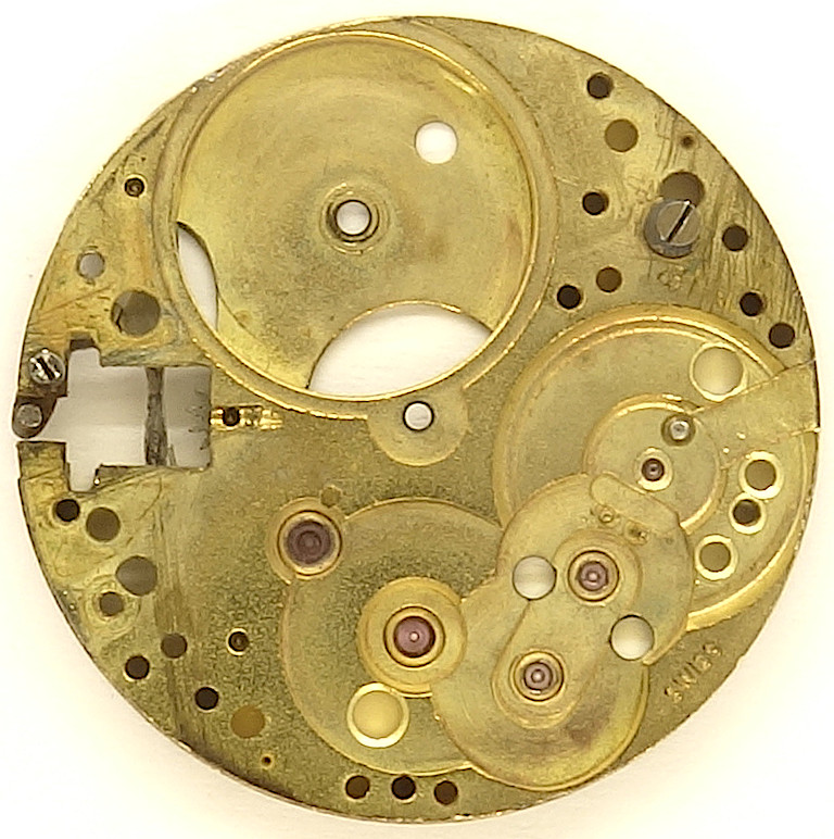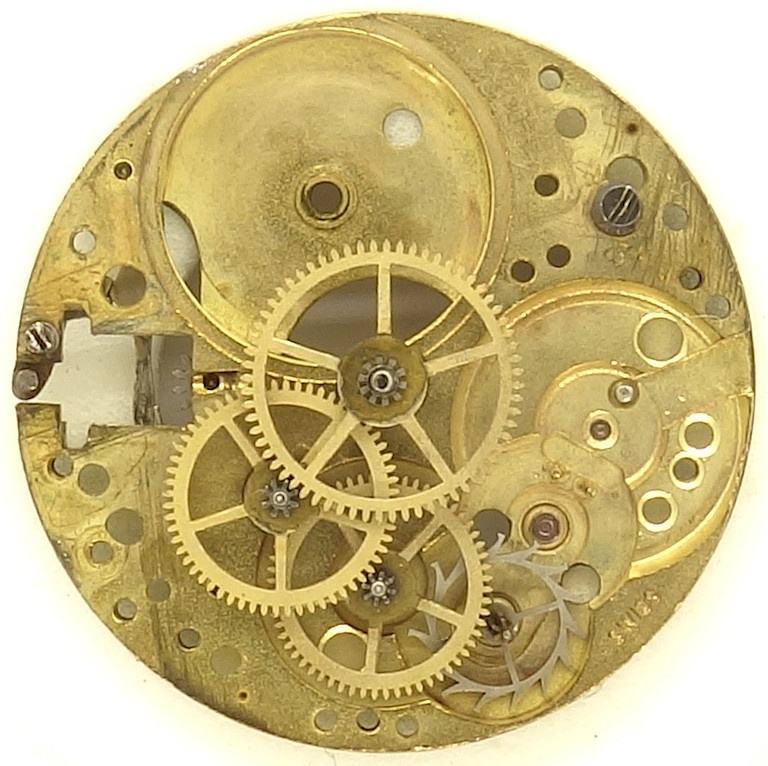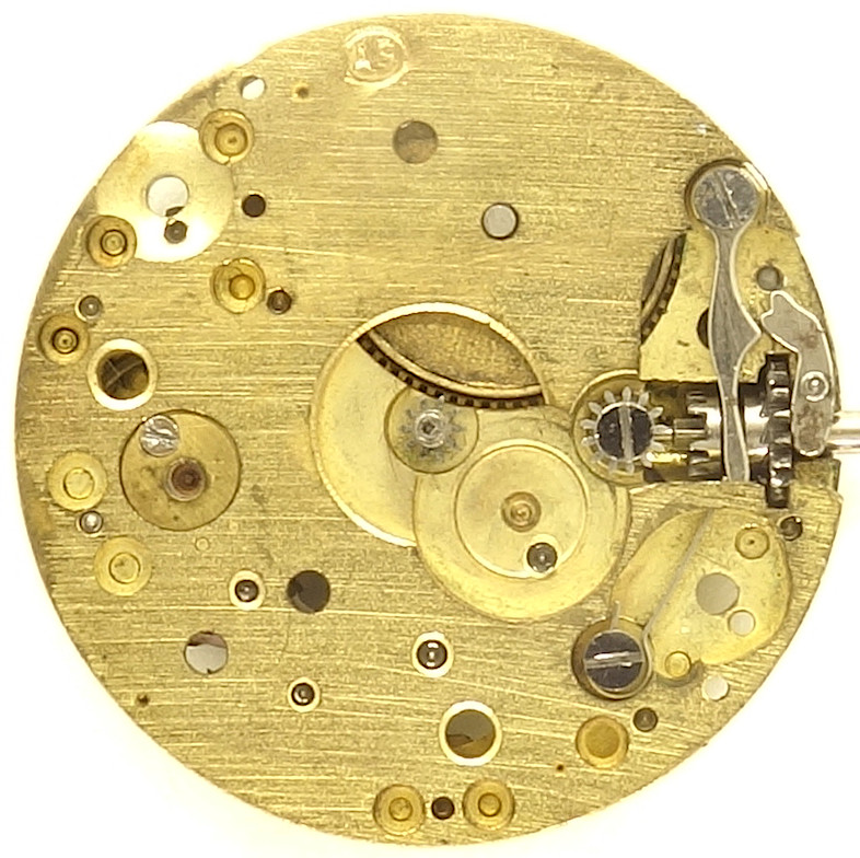 Schön zu sehen ist die alte AS-Punze auf 12 Uhr. Zusammen mit der goldenen bzw. messingfarbenen Ausführung der Platinen ein deutliches Indiz für die 1920er Jahre.