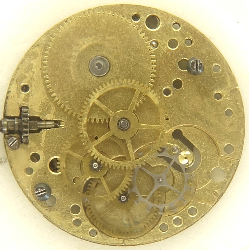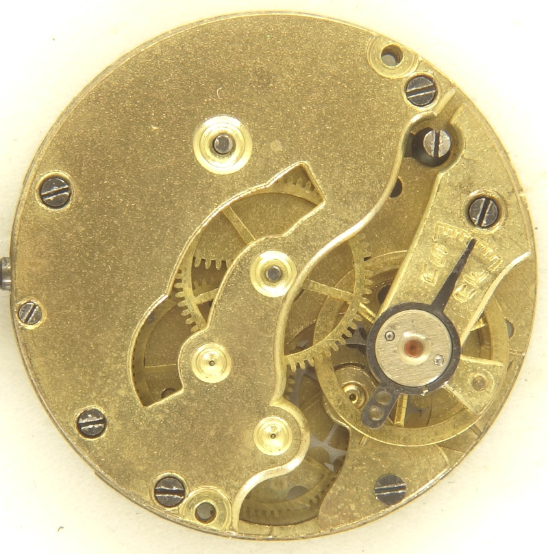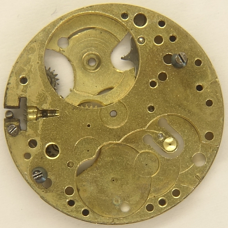 Dieses Zylinderwerk, möglicherweise aus den 1920er Jahren, besitzt einen Durchmesser von 9 3/4 Linien. Trotz seiner sehr eigenständigen Form der Dreiviertelplatine und trotz einer partiellen Beschriftung auf der Zifferblattseite läßt es sich nicht identifizieren.