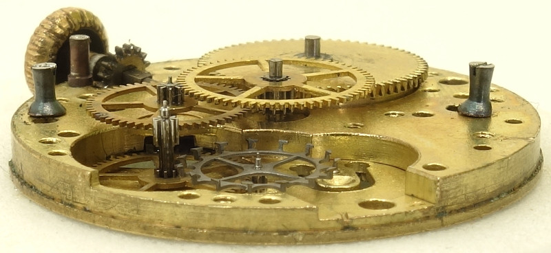 Das Räderwerk ist typisch für ein Zylinderwerk: Federhaus, direkt angetriebenes Minutenrad, Kleinbodenrad, Sekundenrad auf 6 Uhr (hier aber ohne verlängerte Achse für einen Sekundenzeiger) und Stahl-Zylinderrad.