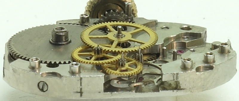 Um Platz zu sparen, befand sich das zifferblattseitige Lager des Sekundenrads oberhalb des Ankerrads, eine quasi zweistöckige Bauweise.