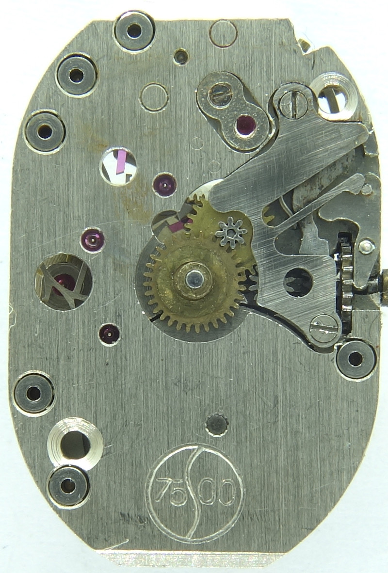 Aus den 1950er Jahren stammt das hier vorgestellte Formwerk für Damenuhren Asco 7500 mit einer Größe von nominell 5 1/4 Linien (real waren es 5 3/4 Linien). Es paßte somit anfangs gut für die damals populären kleinen, rechteckigen Damenuhren, war aber gegen Ende der 1950er Jahre technisch und auch von der Größe aus der Zeit gefallen.
