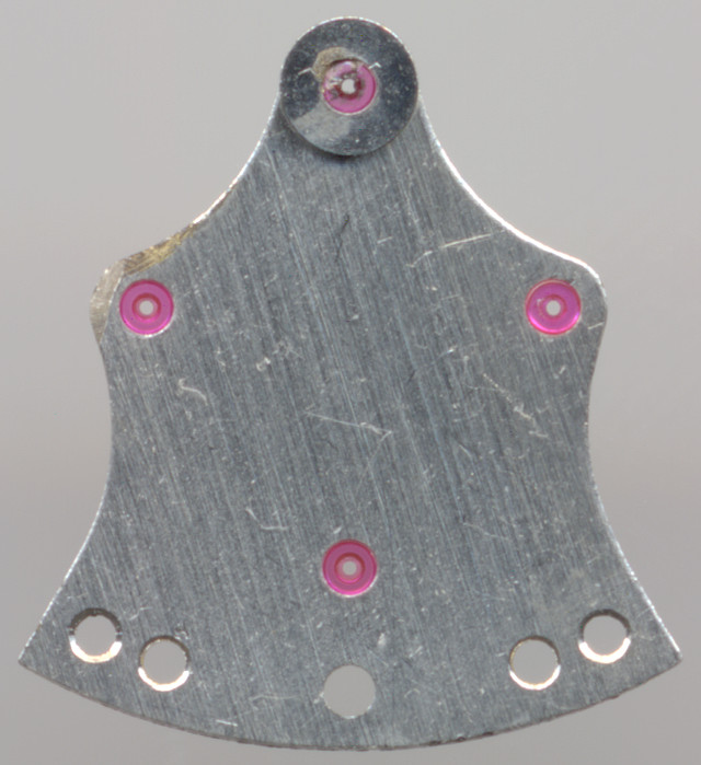 Die untere Automaticbrücke, die quasi auf der Räderwerksbrücke liegt und die durch zwei Schrauben am Werksring befestigt ist, besitzt vier Lagersteine, einer für die Pendel-Achse, zwei für die beiden Wechselräder und einer für den Segment-Treiber, der im Eingriff mit dem Pendel steht und dessen Klinken die beiden Wechselräder stets in dieselbe Richtung drehen.