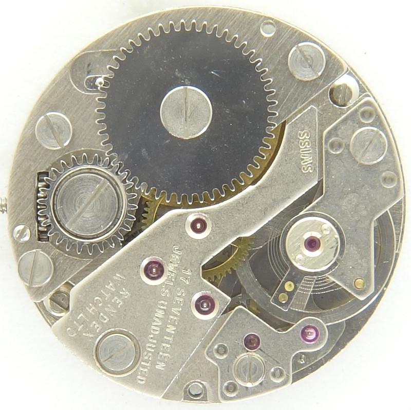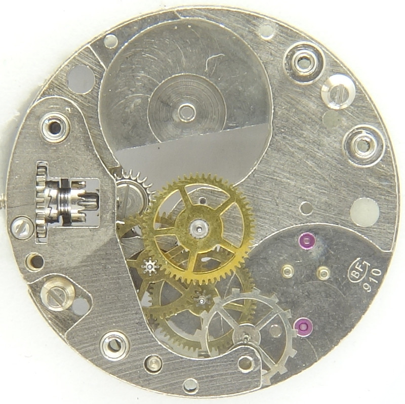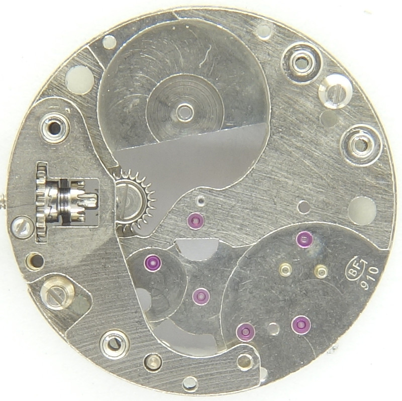 Zifferblattseitig macht das Baumgartner 910 einen überraschend positiven Eindruck: Als Aufzugsmechanismus kommt ein zwar einfacher, aber sehr funktionell konstruierter Kupplungsaufzug zum Einsatz, der nur aus zwei Bauteilen, der Federwippe und dem Winkelhebel besteht.