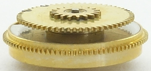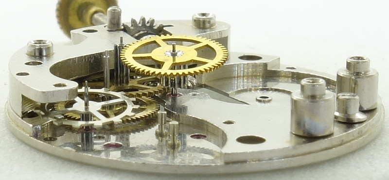 Hier noch der letzte Beweis für die Roskopf-Konstruktion: Das Federhaus besitzt zifferblattseitig das mit einer Rutschkupplung versehene Wechselrad, das gleichzeitig Minuten- und Stundenrohr antreibt.