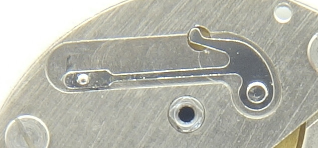 Recht genial wurde das werksseitige Gesperr gelöst: Unter dem Sperrad ist in einer Vertiefung der Federhausbrücke die Sperrklinke gelagert, die gleichzeitig ihre eigene Feder ist.