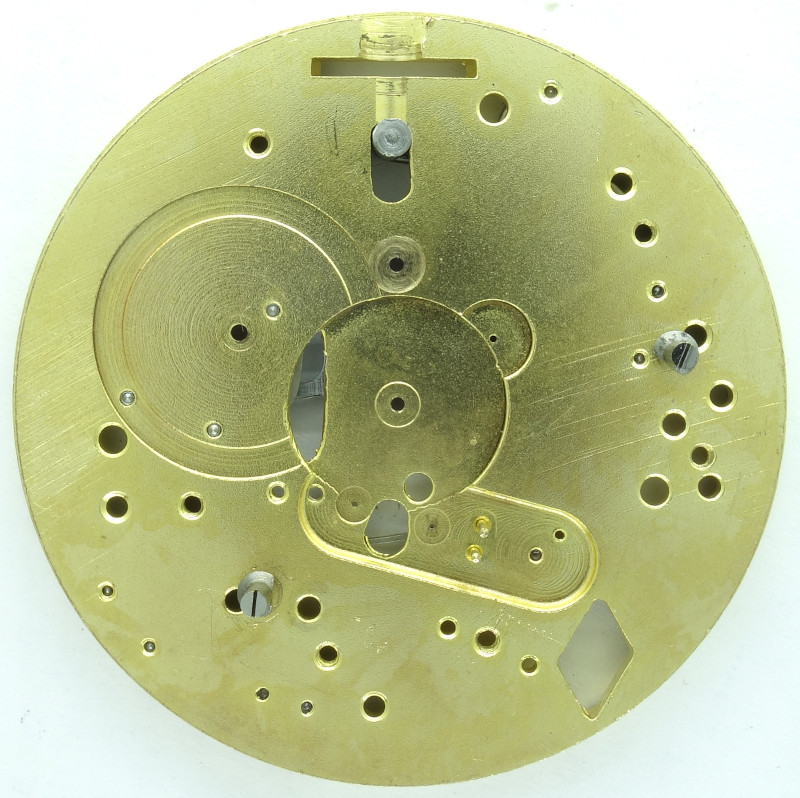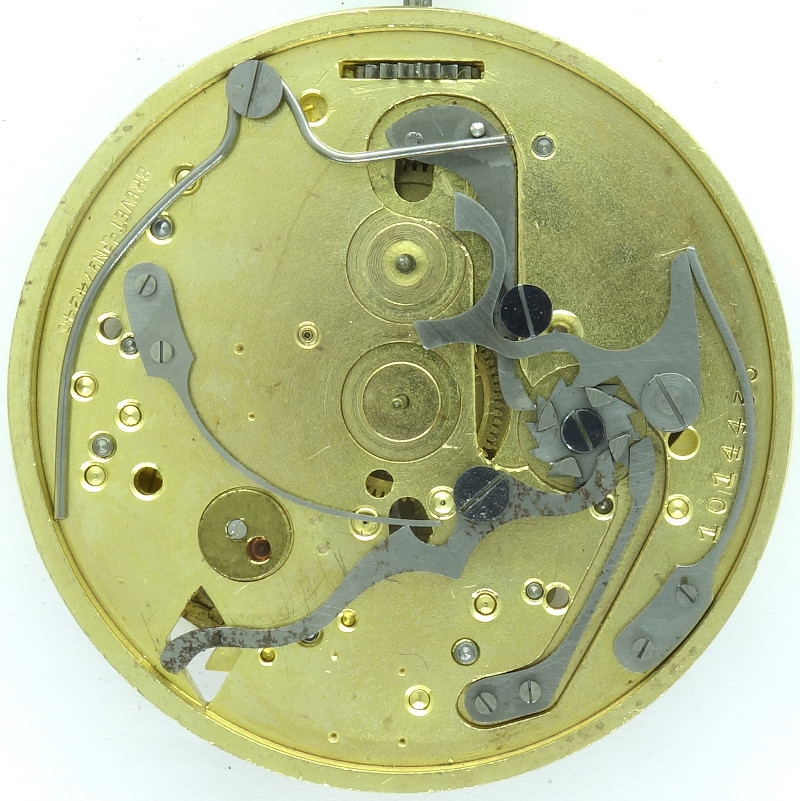 Auf der Zifferblattseite ist der komplette Stoppuhrmechanismus mit Anwurf- und Bremshebel, mit Rückstellhebel mit Schaltrad und mit dem Schalthebel zu finden.