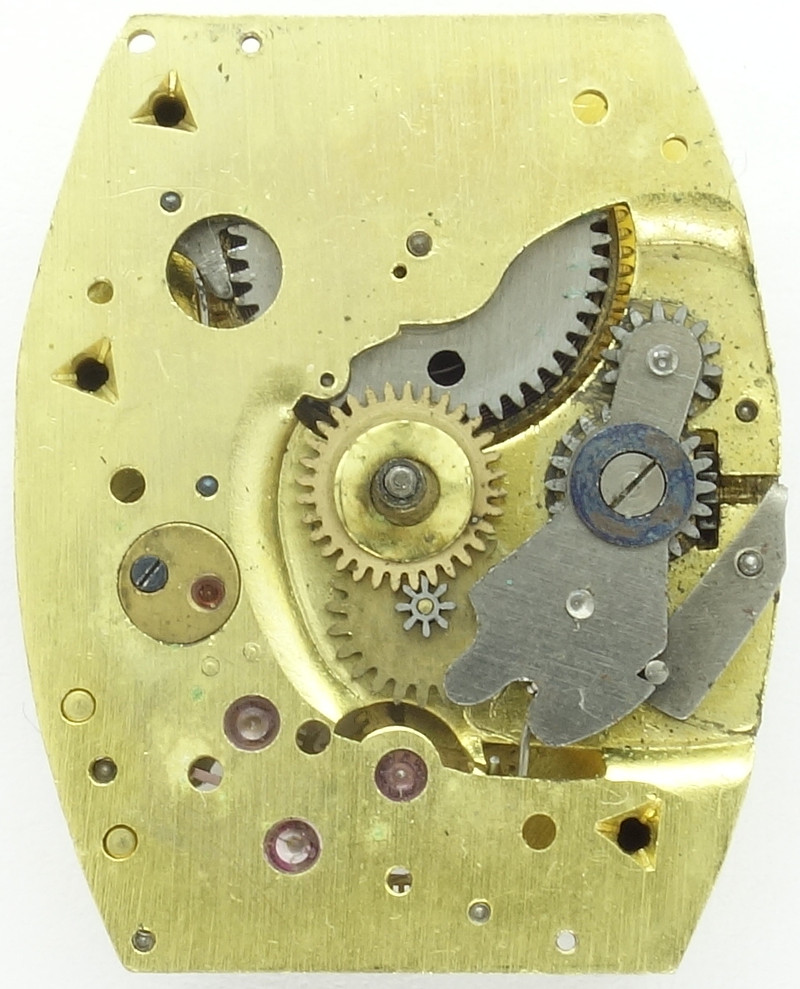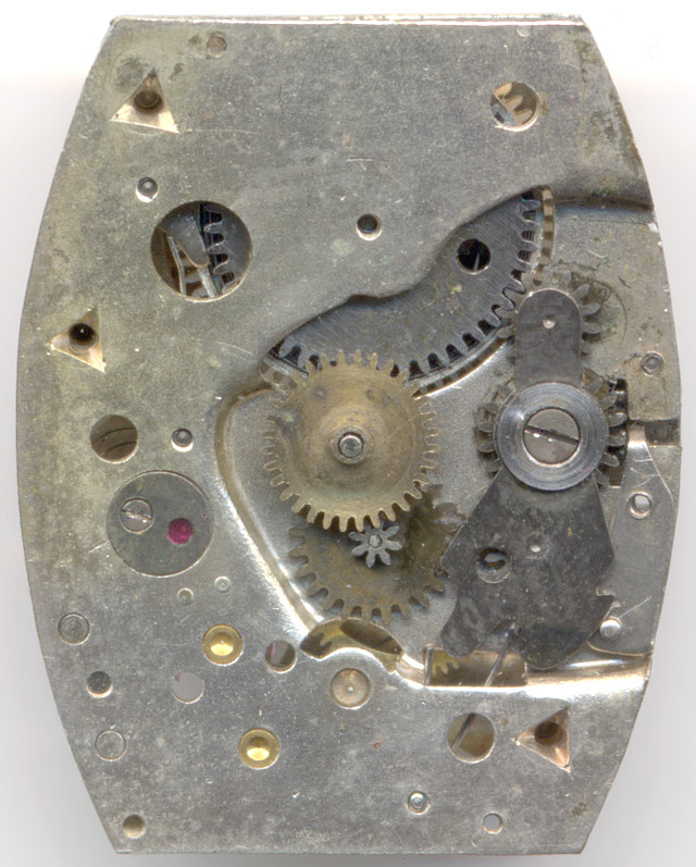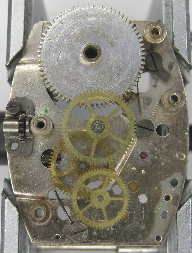 Die gestanzte Grundplatine erinnert sehr an preiswerte Werkskonstruktionen, die zu dieser Zeit vor allem in runder Form allgegenwärtig waren. In der hier gezeigten Ausführung sind sogar die Lager mit Messingbuchsen anstatt mit Lagersteinen versehen.