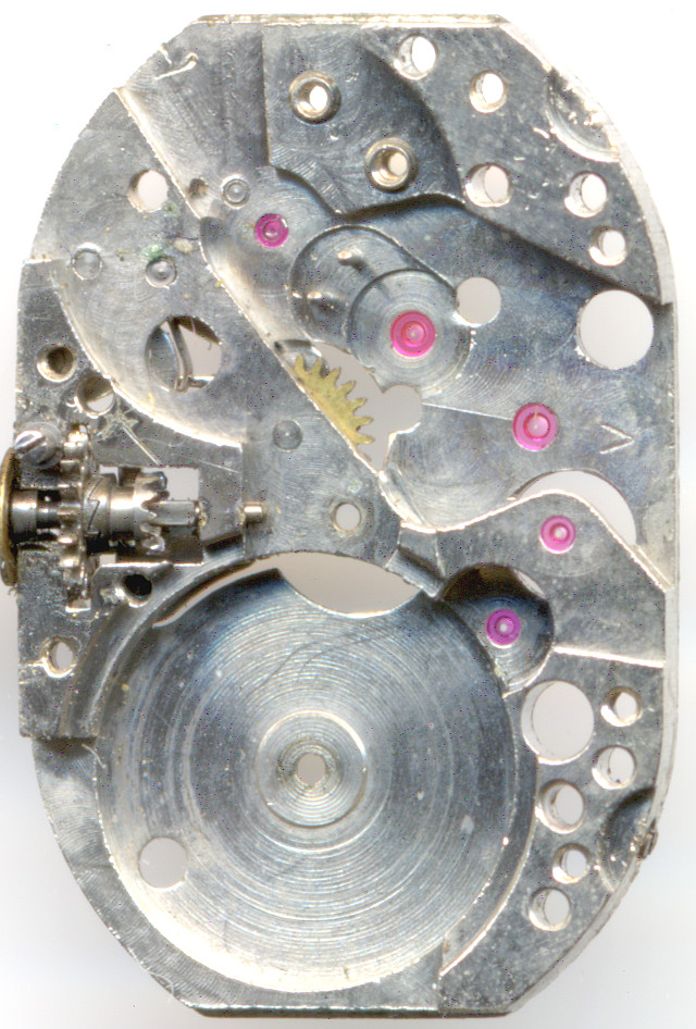Die Grundplatine ist massiv und besitzt den typischen Aufbau kleiner Formwerke, bei dem sich die Räder bzw. Lager teilweise überlagern.