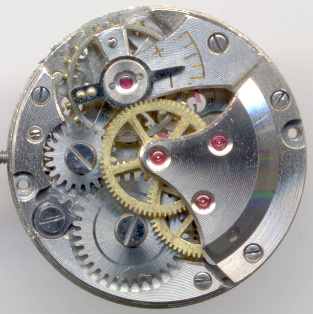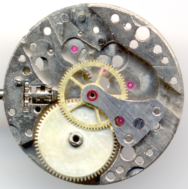 Wie bei vielen besseren Werken aus den 1950er Jahren, so verwendet auch das Bifora 734 ein zentrales Minutenrad, das direkt vom Federhaus angetrieben wird.