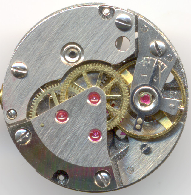 Beim Räderwerksaufbau erkennt man, daß sich Minutenrad und Zentralsekundenrad übereinander befinden und daß beide denselben Durchmesser, genau wie das Kleinbodenrad haben. Mah erkennt weiterhin, daß die Aussparung der Unruh bis fast in die Werksmitte reicht, also extrem wenig “Luft” ist. Der Einbau der Unruh ist daher extrem schwierig, da die Unruhspirale zusammen mit der Unruh unter beiden Rädern liegt und nur sehr wenig Platz hat. Möglicherweise war das auch der Grund, wieso dieses Kaliber relativ schnell wieder eingestellt wurde.