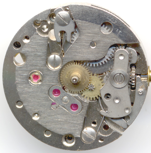 Schon an der Grundplatine erkennt man zwei Dinge: Erstens sind alle wichtigen Lager mit Lagersteinen ausgestattet und zweitens wird ein Wippenaufzug mit zifferblattseitigem Gesperr verwendet.