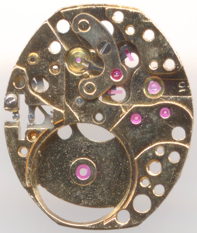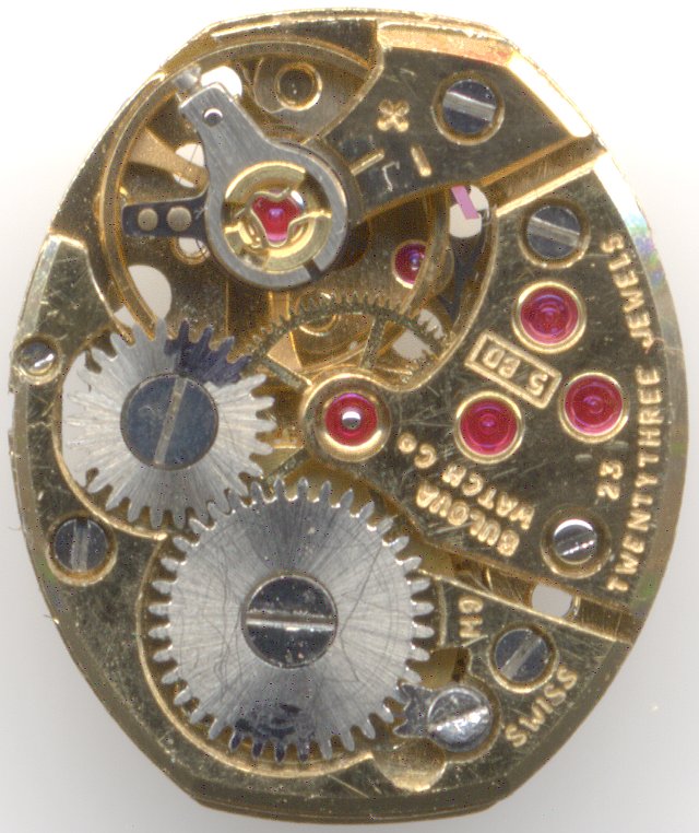 Das Bulova 5 BD ist ein außergewöhnlich gut verarbeitetes Damenuhren-Formwerk, welches grob um 1970 debütierte. Es beeindruckt nicht nur durch seine hochglanzpolierte goldfarbige Ausführung, sondern vor allem durch die Zahl der verbauten Steine: 23 Stück sind in dieser Klasse rekordverdächtig!