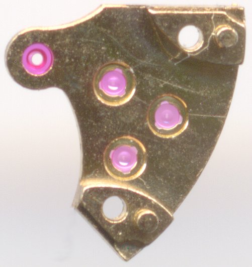 Die Räderwerksbrücke besitzt ebenfalls drei eingefaßte Steinlager mit Deckstein, wodurch das Ankerrad auf beiden Seiten in 4 Steinen, Sekunden- und Kleinbodenrad in 3 Steinen (werksseitig zwei, zifferblattsetig “nur” ein normaler Lagerstein) laufen.