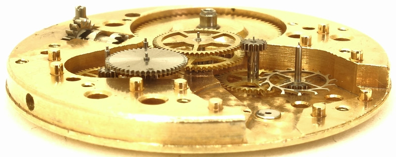 Das recht große, ebenfalls rotgolden ausgeführte, Federhaus treibt das zentrale Minutenrad an, gefolgt von Großboden- und Kleinbodenrad. Nun kommt allerdings ein Übertragungrad aus Stahl ins Spiel, welches über seinen Außenkranz das Zentralsekundenrad antreibt. Dieses wiederum wirkt nochmal auf ein Übertragungsrad mit einem ungewöhnlich hoch verzahnten Trieb ein, welches das Stahl-Ankerrad antreibt, dessen Trieb ebenfalls ungewöhnlich hoch verzahnt ist.