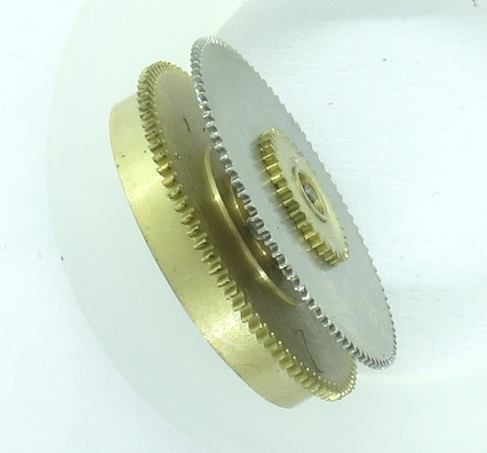 Das Minutenrohr greift in den äußeren Zahnkranz, das wesentlich größere Stundenrohr (eher als Stundenrad zu bezeichnen) in den kleinen Zahnkranz des Federhauses ein.