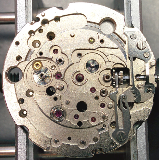 Schon bei der Grundplatine wird klar, daß dieses Werk auf Langlebigkeit ausgelegt ist, jedes Lager, mit Ausnahme des Federhauses, besitzt einen Lagerstein, Decksteine gibt es bis auf die Unruhlager keine.