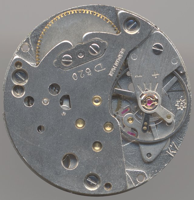 Das Diehl 620 ist vom Aufbau her bereits sehr modern, mit großer (serviceunfreundlicher) Dreiviertelplatine und großer dreischenkligen Ringunruh, die in Star-Shock Stoßsicherungen gelagert ist. Antiquiert hingegen ist die kleine, dezentrale Sekunde auf “6”, die schon damals eigentlich längst passeé war.