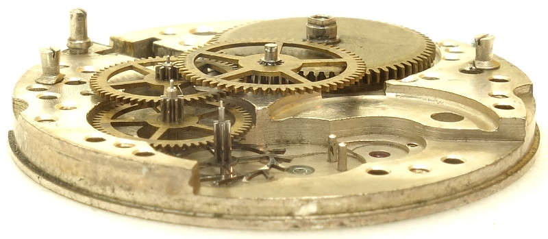 Auf der Zifferblattseite erkennt man den Kupplungsaufzug, dessen Winkelhebelfeder im vorliegenden Exemplar etwas hemdsärmlig “repariert” wurde.